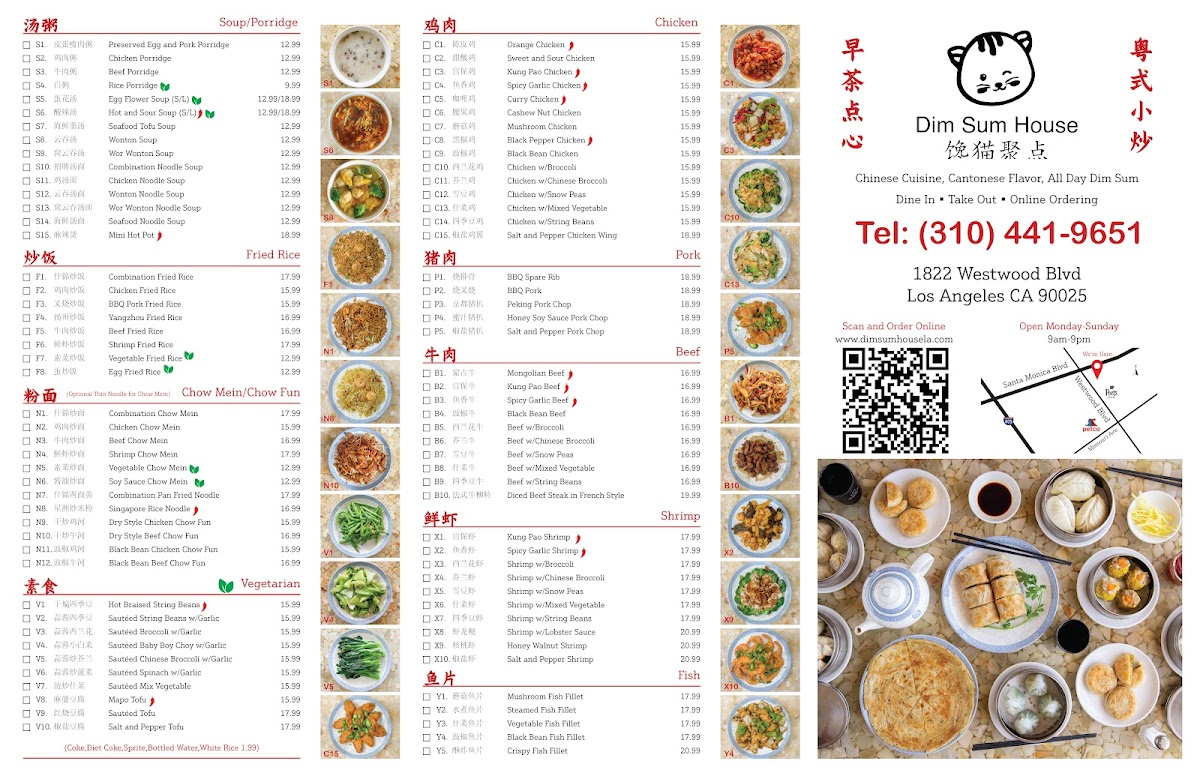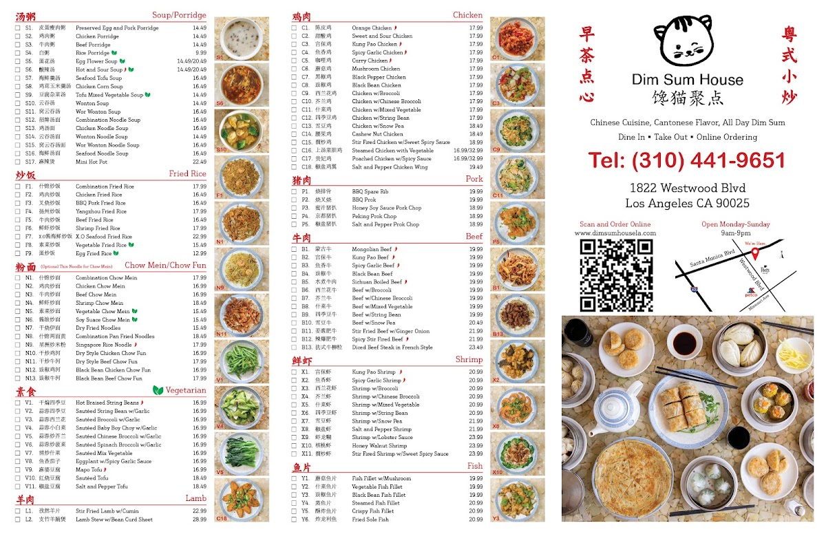 Welcome to Dim Sum House - Los Angeles, where culinary traditions blend with modern flair! Located on Westwood Blvd, this gem offers a tantalizing menu filled with authentic dim sum and comforting dishes. Highlights include the succulent Peking Pork Chop and delightful Preserved Egg and Pork Rice Porridge. Diners rave about the generous portions and the quality of the food, with favorites like shrimp dumplings and custard buns stealing the show.